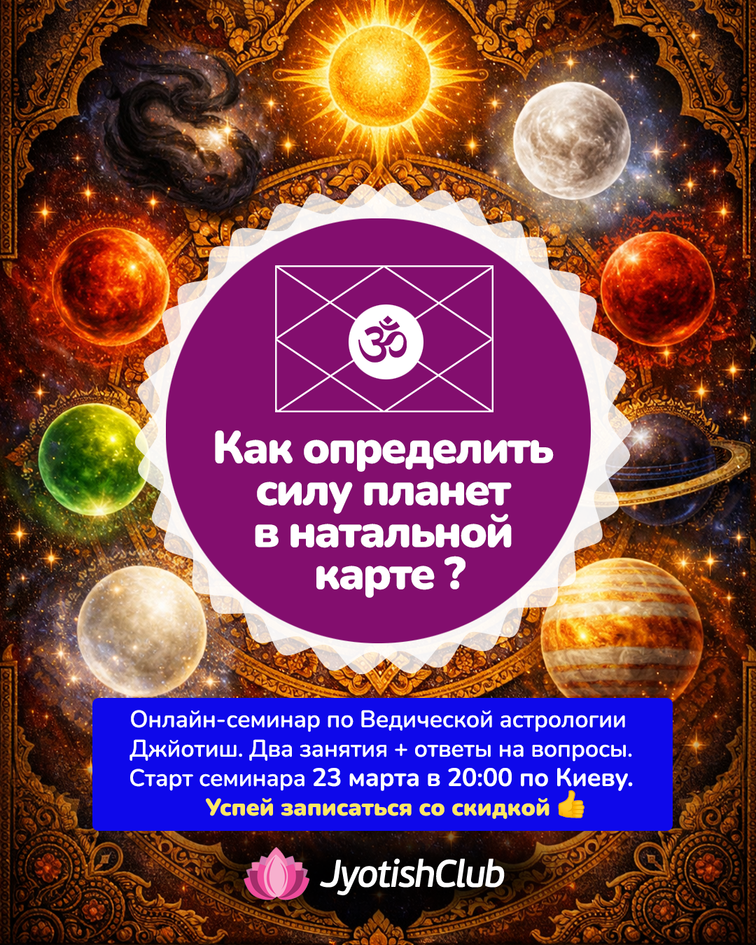 Друзья, приглашаем вас на наш первый онлайн-семинар по Ведической астрологии Джйотиш: «Как определить силу планет в натальной карте?». Мы решили провести этот семинар не случайно. Анализируя ваши вопросы и общение с вами, мы заметили одну важную вещь:у многих уже есть базовые знания по Джйотиш, но при анализе натальной карты возникает самая сложная задача — как […]