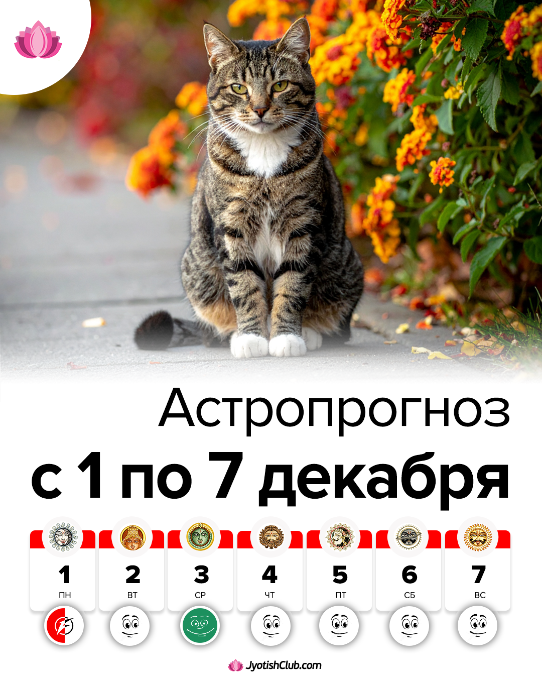 Друзья, нас ожидает в целом нейтральная неделя. Напряженным днем будет первая половина понедельника (1 декабря). Среда (3 декабря) будет благоприятным днем. Все остальное время пройдет в нейтральных энергиях.